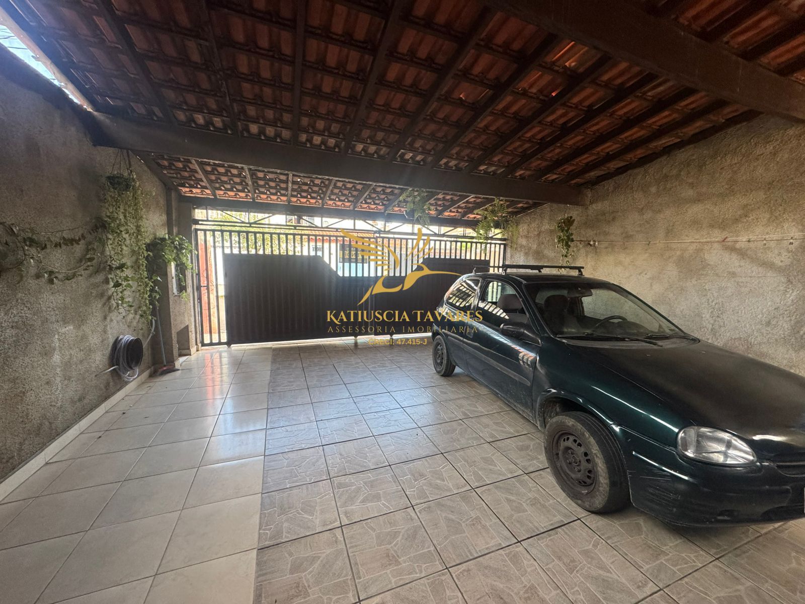 Garagem grande e coberta cabendo 4 carros.
